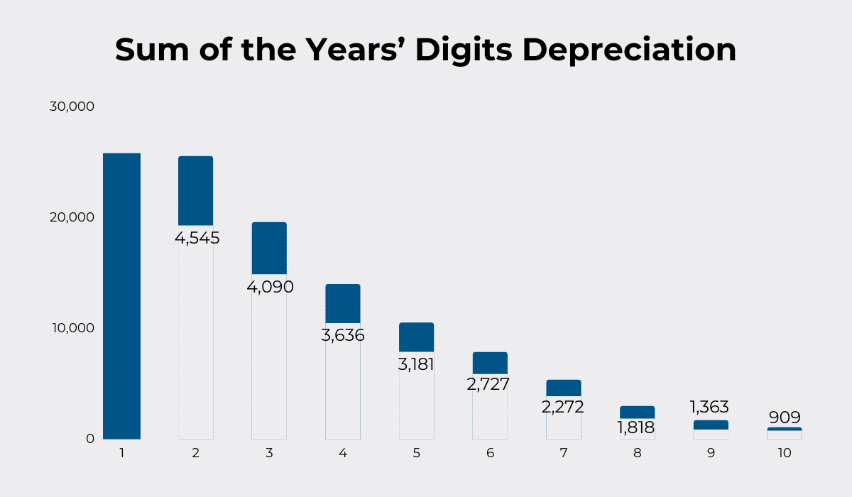 The image below shows what the sum of the years’ digits depreciation method looks like in practice.