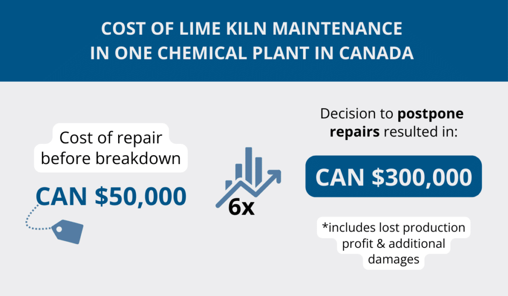 Instead of CAN $50,000, a chemical plant in Canada ended up paying a total of CAN $300,000 due to the unexpected breakdown of its lime kiln, an essential production component.