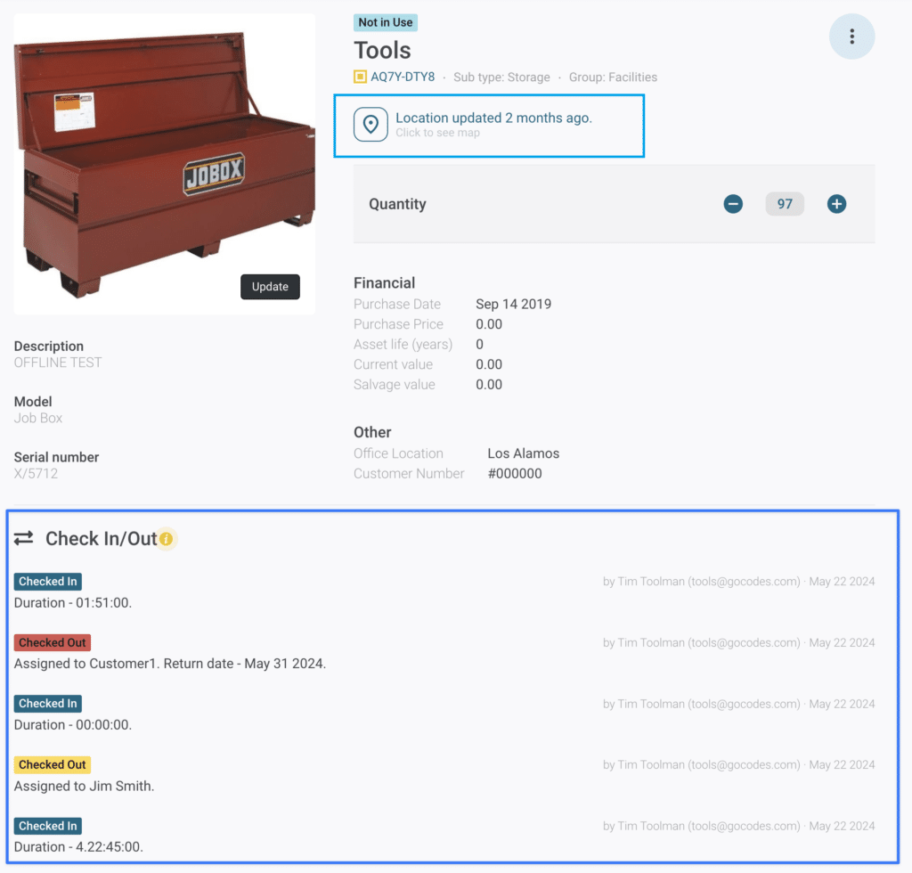 Furthermore, using the GoCodes Asset Tracking app brings the user experience to a whole new level, allowing you to access the telematics module, view asset locations on a map, and check out and update multiple asset information.