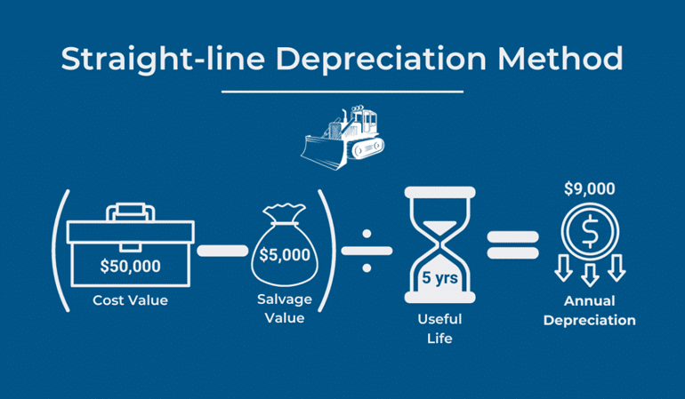 Here’s an example of how it’s calculated for a $50,000 bulldozer with a $5,000 salvage value and a 5-year useful life.