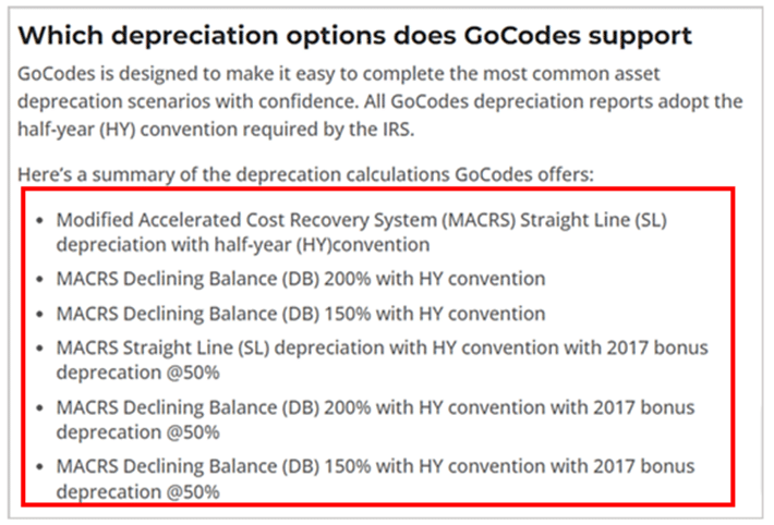 Moreover, they can use GoCodes Asset Tracking to input the above info and calculate annual depreciation rates according to the different most common IRS depreciation conventions.