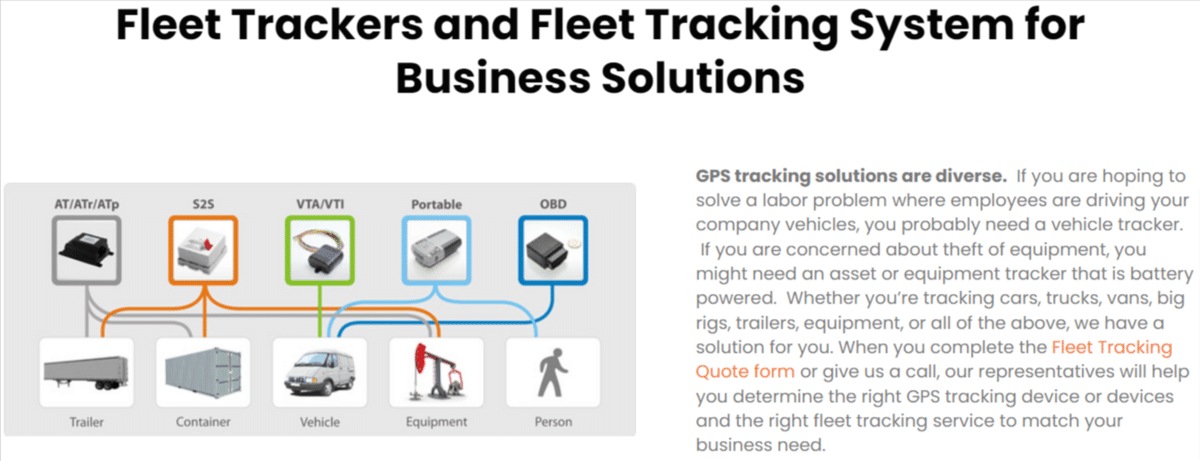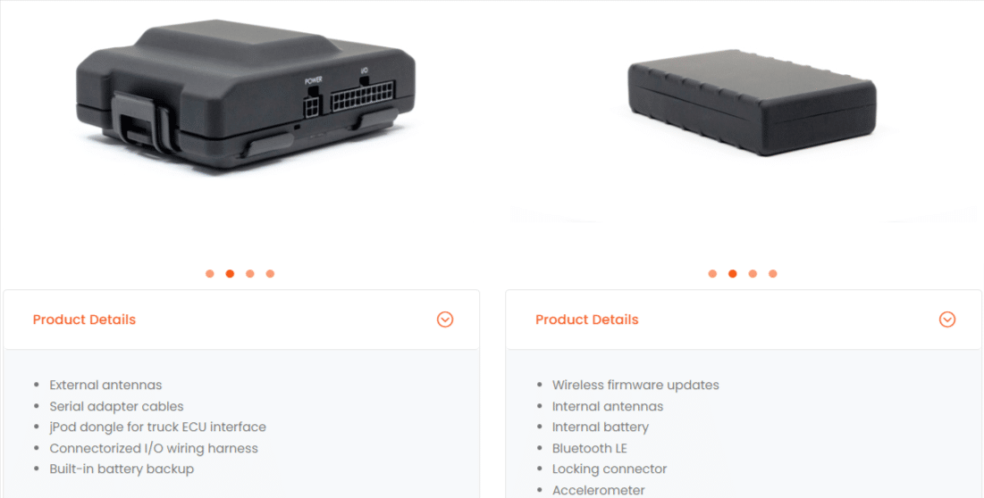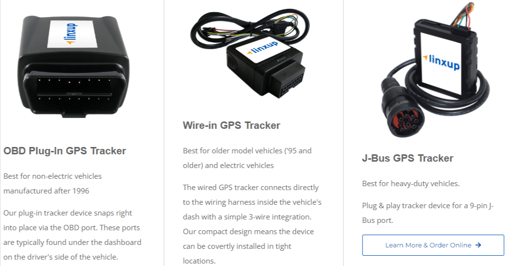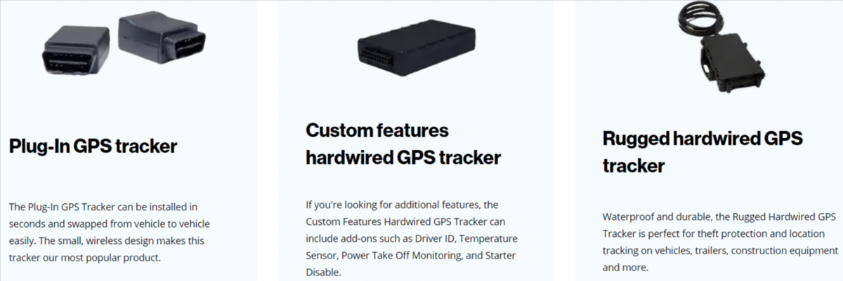 In terms of hardware, they actually offer several types of GPS tracking devices including OBD plug-in, wire-in, and J-Bus trackers.