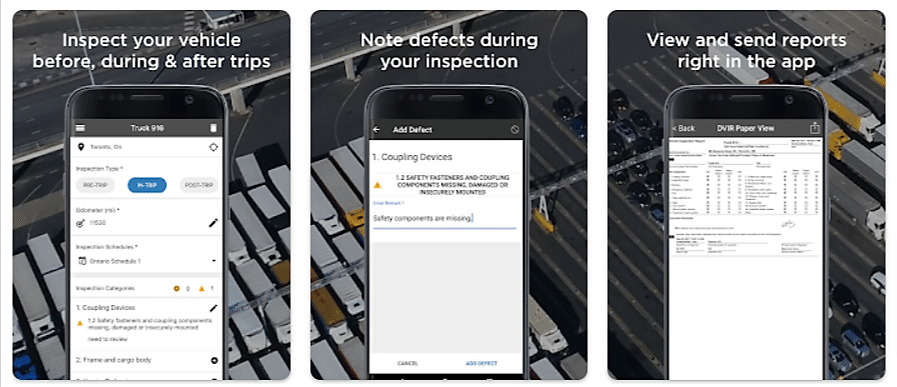 As illustrated, this app helps drivers inspect their vehicles, note identified defects or issues, and send the inspection report to the fleet manager or assigned service technicians.