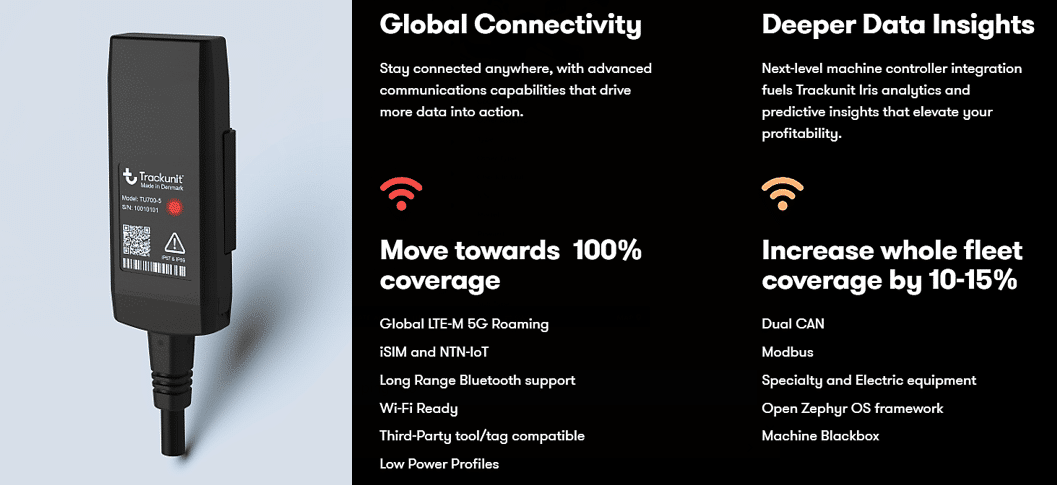 Additionally, the latest version of Trackunit Raw, TU700, provides advanced data collection and remote management capabilities, such as global roaming, Wi-Fi, and long-range Bluetooth support.
