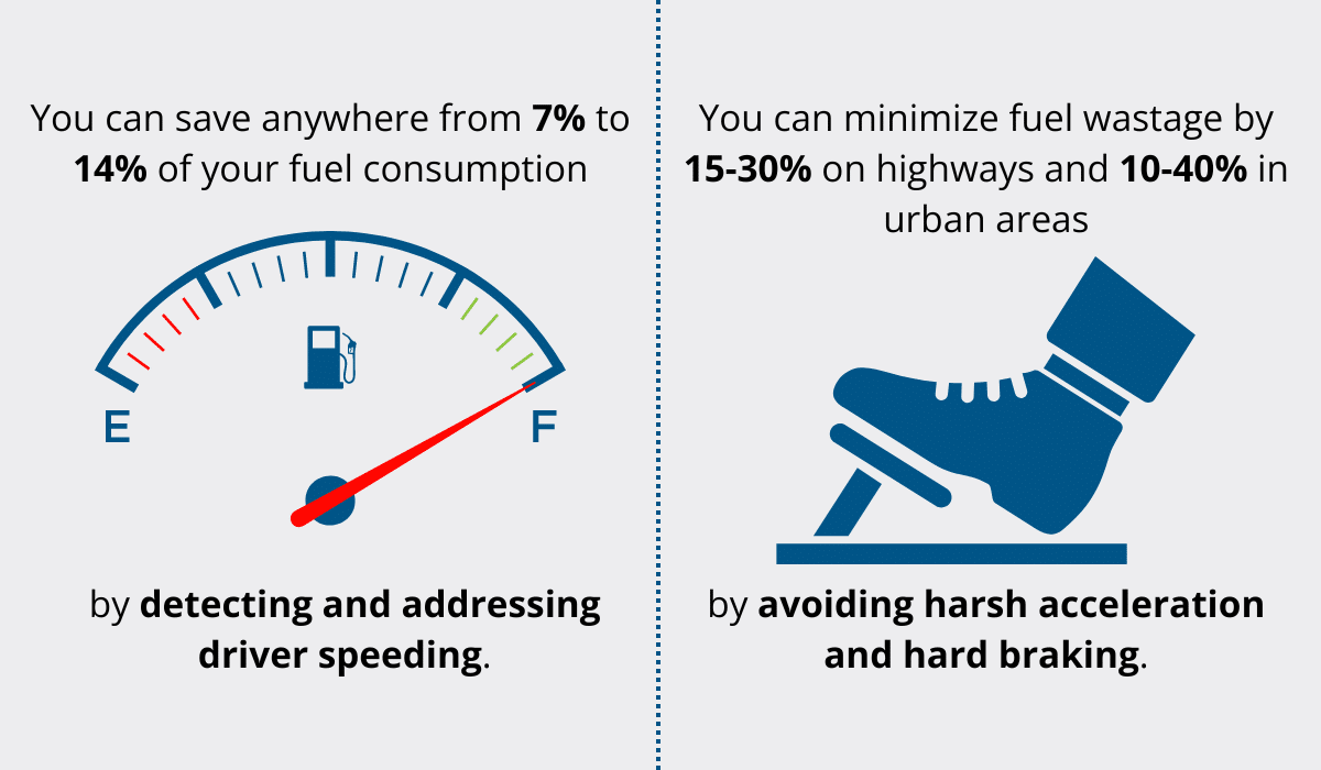 For instance, by detecting and addressing driver speeding, i.e., encouraging them to reduce their speed by 5 to 10 mph, you can save anywhere from 7% to 14% of your fuel consumption, as calculated by the U.S. Department of Energy.