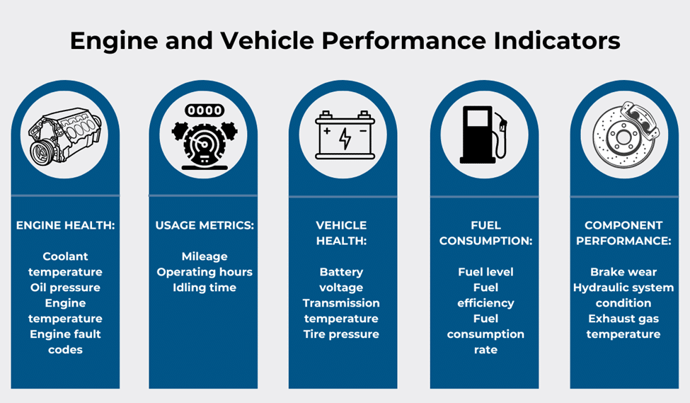One critical aspect is the telematics ability to track various engine and vehicle performance indicators. This is done via internal on-board diagnostics or external sensors.