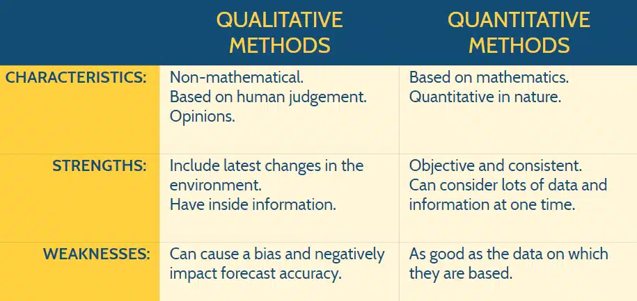 The two main types of inventory forecasting are qualitative and quantitative forecasting.
