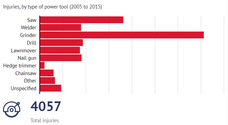 As you can see, angle grinders are the leading cause of injuries, followed by saws and three almost equally dangerous power tools—drills, nail guns, and welders.
