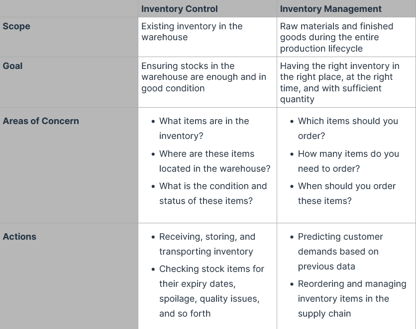To summarize the table, inventory control focuses on ensuring that your company has enough stock in storage and that those items are in good condition.