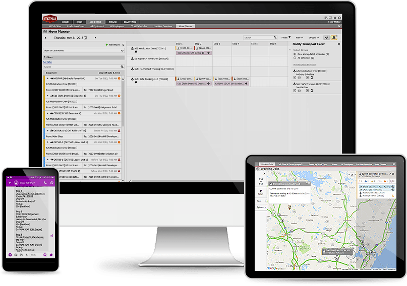 This tool allows companies to manage employees, crews, equipment, materials, and trucking across multiple job locations.