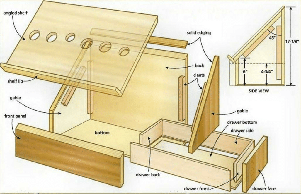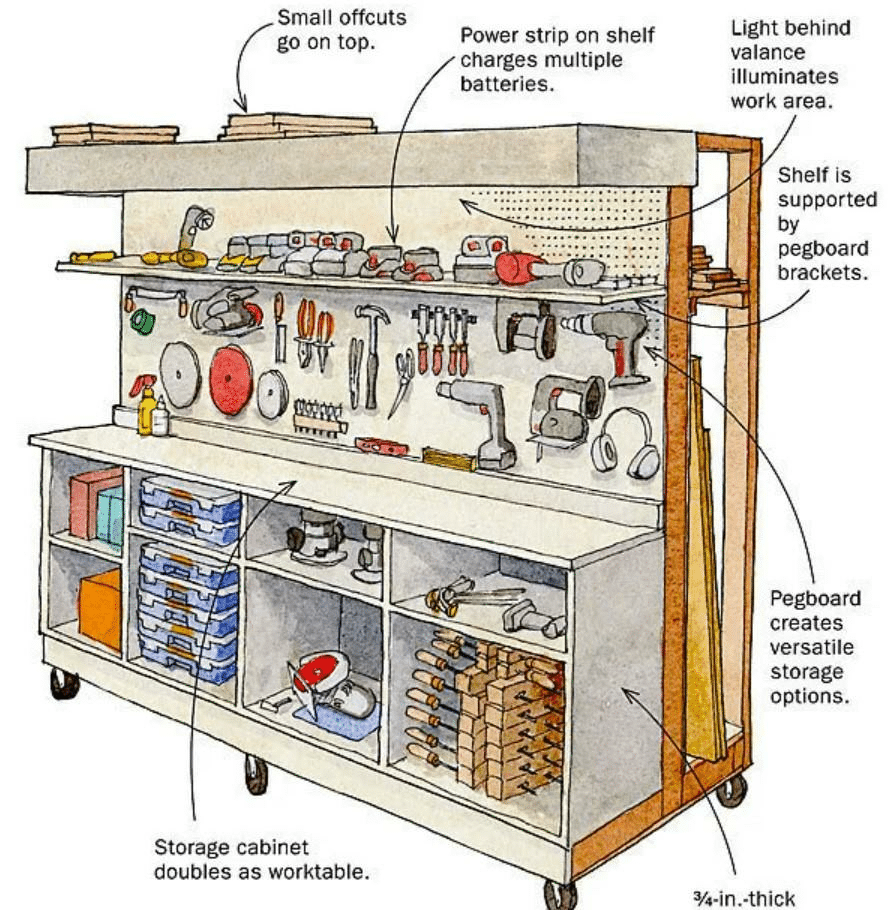 The above illustration shows a rolling workstation that includes pegboards, a light, and a storage area that doubles as a work table.