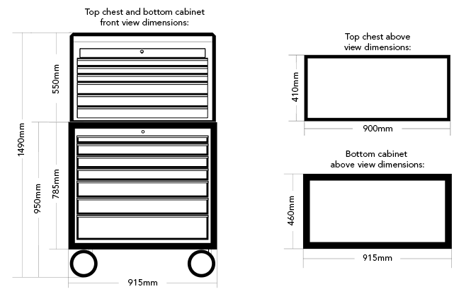 The above schematics indicate the usefulness of a professional tool chest that consists of a top chest and a bottom cabinet. This allows for an intuitive and mobile system of organization.