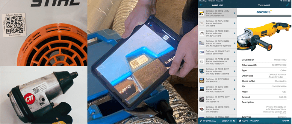 From then on, workers can use their smartphone or tablet (with the GoCodes Asset Tracking cloud software and in-app scanner installed) to quickly scan the tool/equipment tag and access its info page, as well as the central list of all tracked assets.