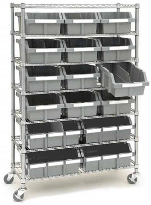 Then, pick a wheeled bin rack equipped with small compartments. For example, the one pictured below.
